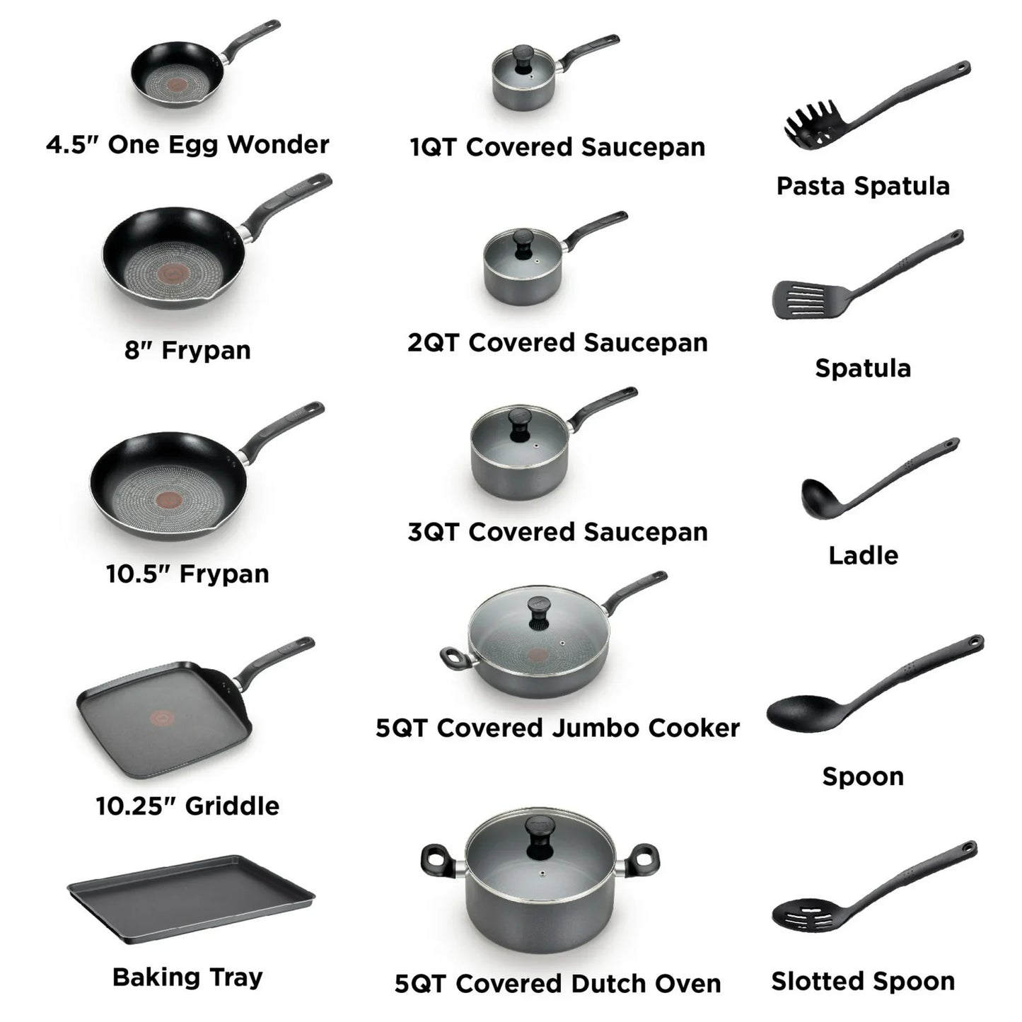 - Elevated Cooking: This set includes 4.5" One Egg Wonder, 8" fry pan with pouring spouts, 10.5" fry pan with pouring spouts, 10.25" griddle, 5QT jumbo cooker with glass lid, 1QT saucepan with glass lid, 2QT saucepan with glass lid, 3QT saucepan with glass lid, 5QT stewpot with glass lid, baking tray, pasta spatula, spatula, ladle, spoon, and slotted spoon.